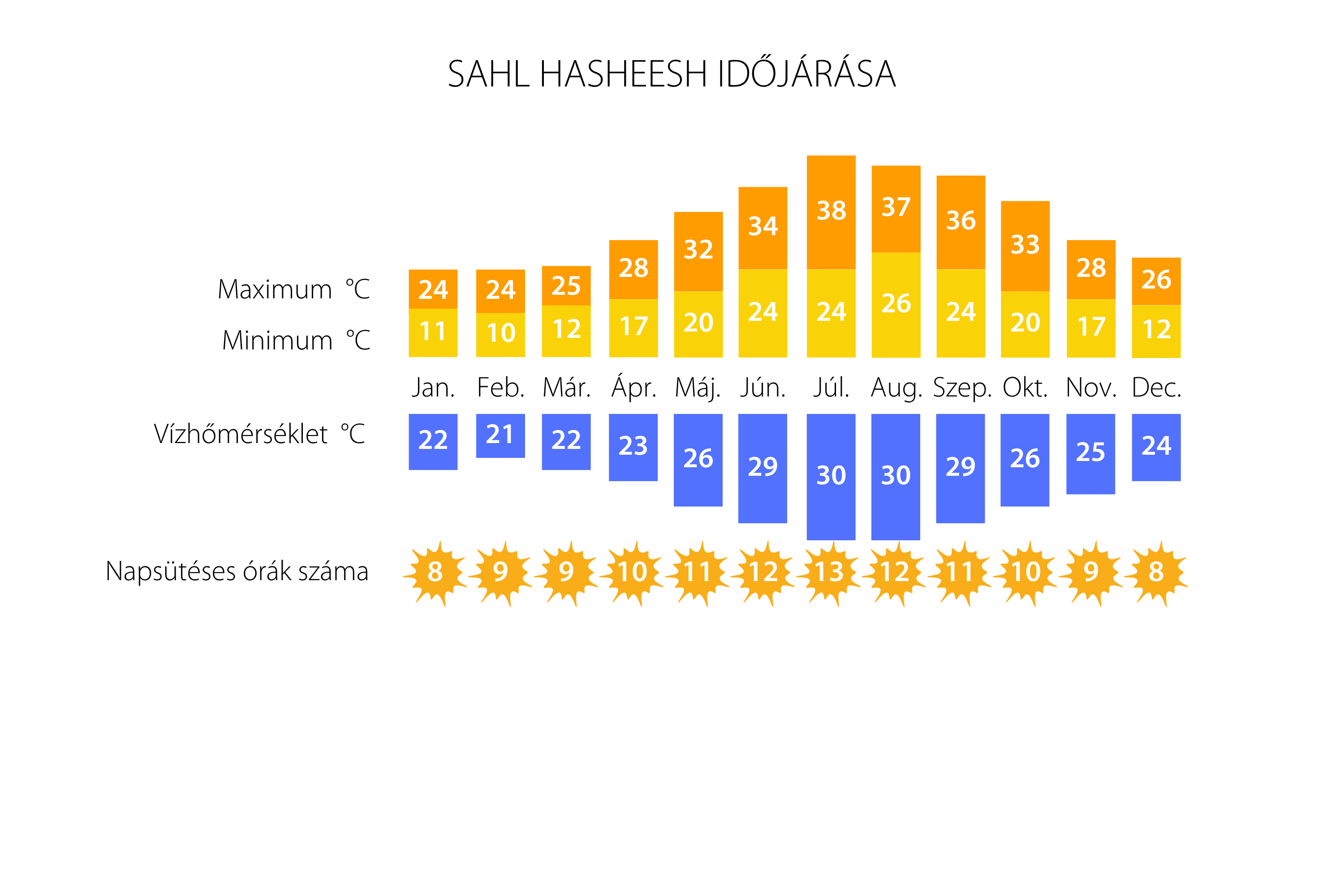 Sahl Hasheesh egész évben látogatható, köszönhetően szubtrópusi éghajlatának. A nyári hónapokban a hőmérséklet gyakran 35 °C fölé emelkedik, miközben a Vörös-tenger kellemes, 28 °C-os hőmérséklete frissítő felfrissülést nyújt. A március–június és szeptember–november közötti időszak különösen kedvező egy hosszabb tengerparti nyaraláshoz. Késő ősszel és télen is ideális úti cél: a 20–25 °C-os nappali hőmérséklet tökéletes azok számára, akik el szeretnék kerülni az otthoni hideget.